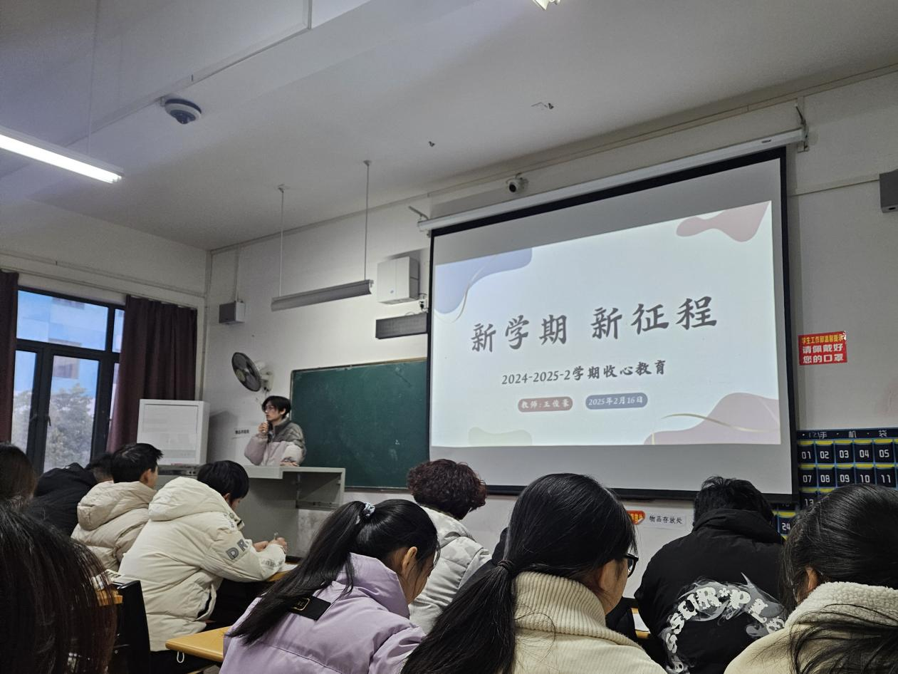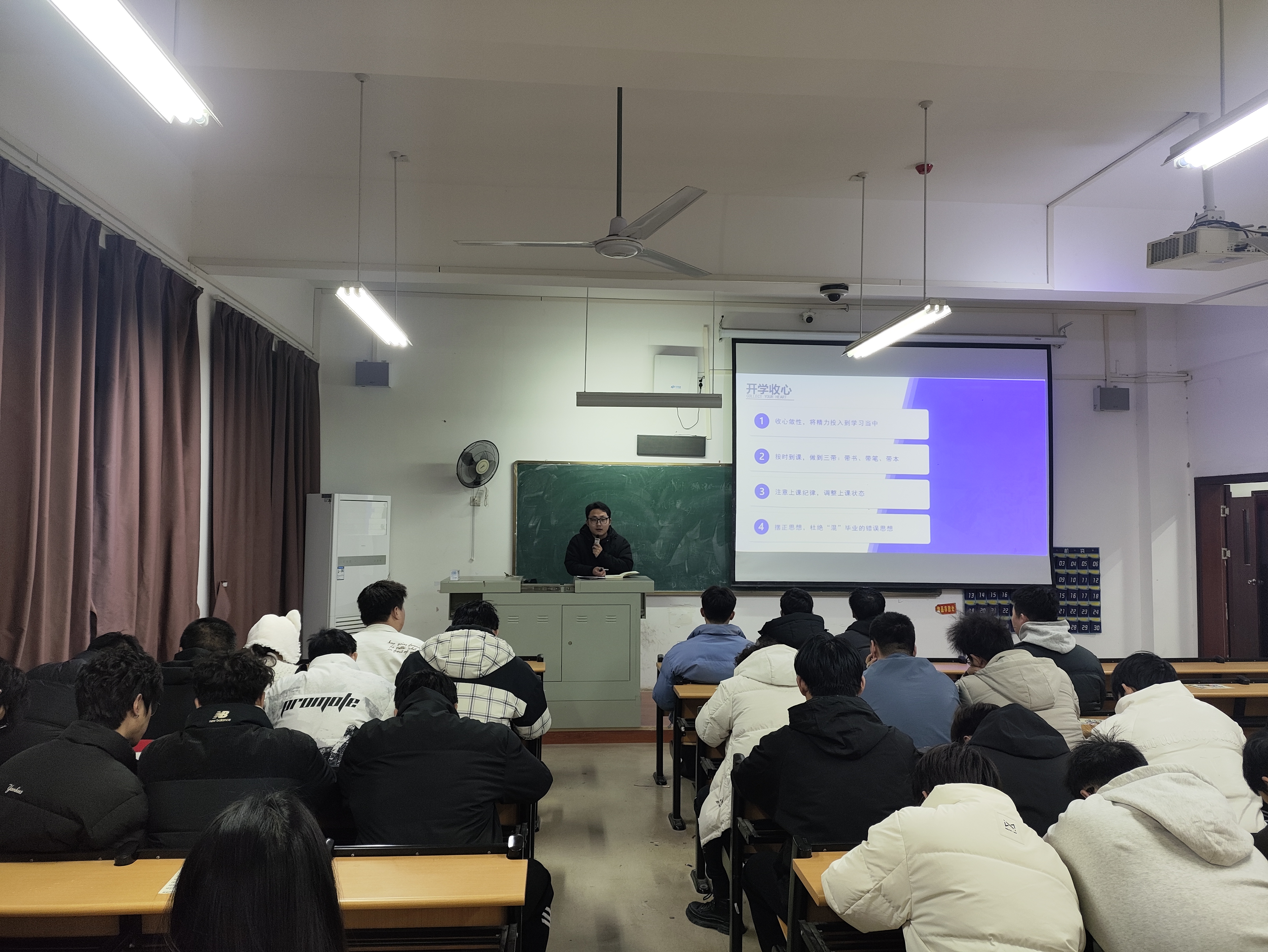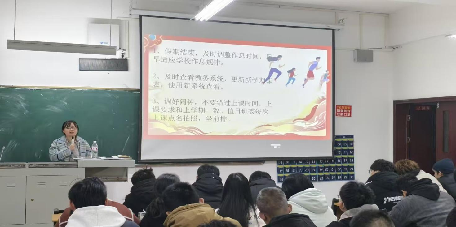 为使学生以饱满的热情和积极的状态投入到新学期的学习生活,2025年2月16日,我院各年级在二号教学楼开展 “新年新征程,收心再出发”主题教育班会。本次班会由各年级辅导员组织,主要内容包括学习规划、安全教育和学风建设,帮助学生明确新学期目标,增强安全意识,调整学习状态。